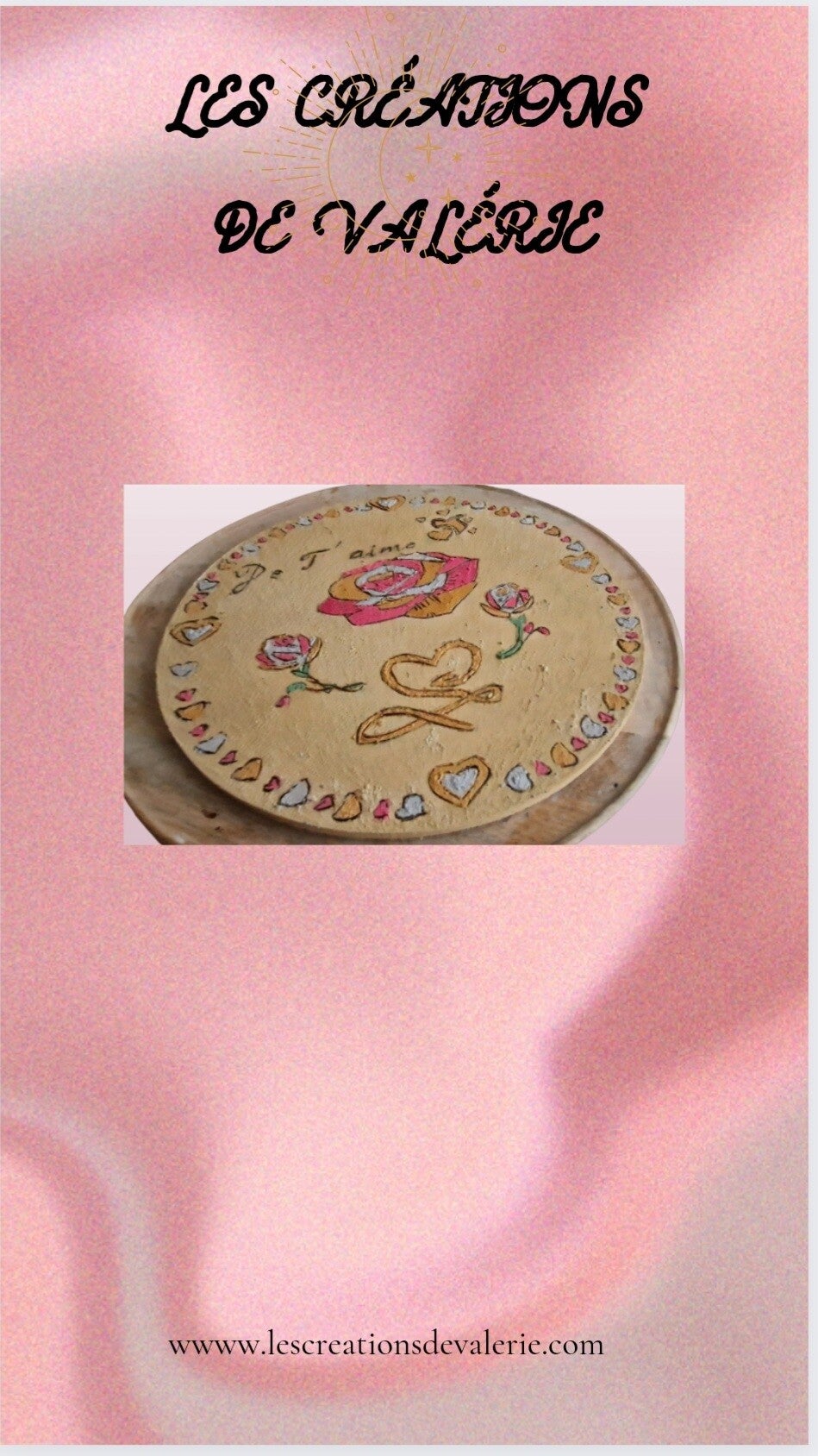 Plateau rond en bois de pin de 30cm, pyrogravé motif fleur rose et cœur, peinture or métallisé, rose,argenté, fabrication fait à la main.