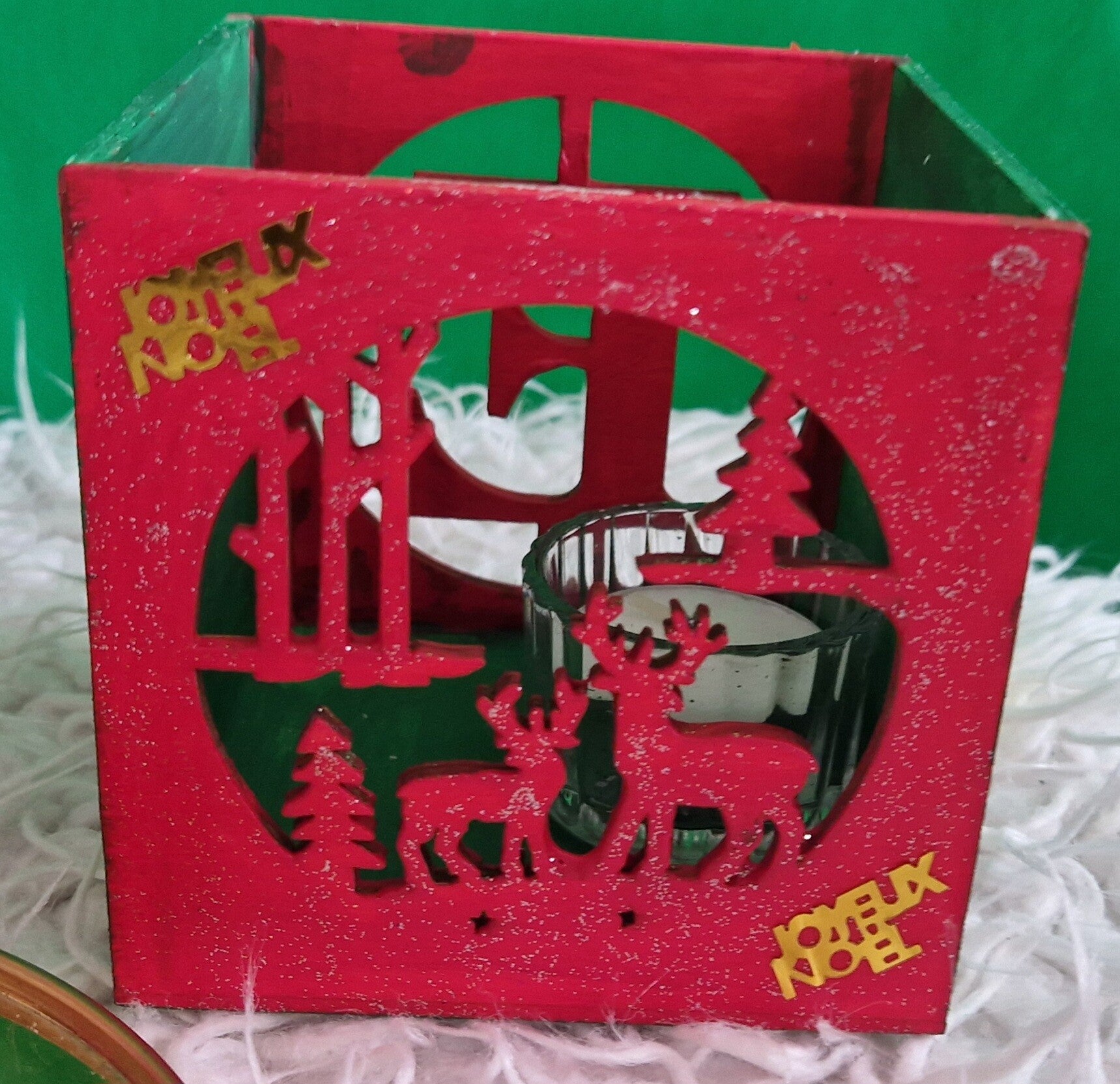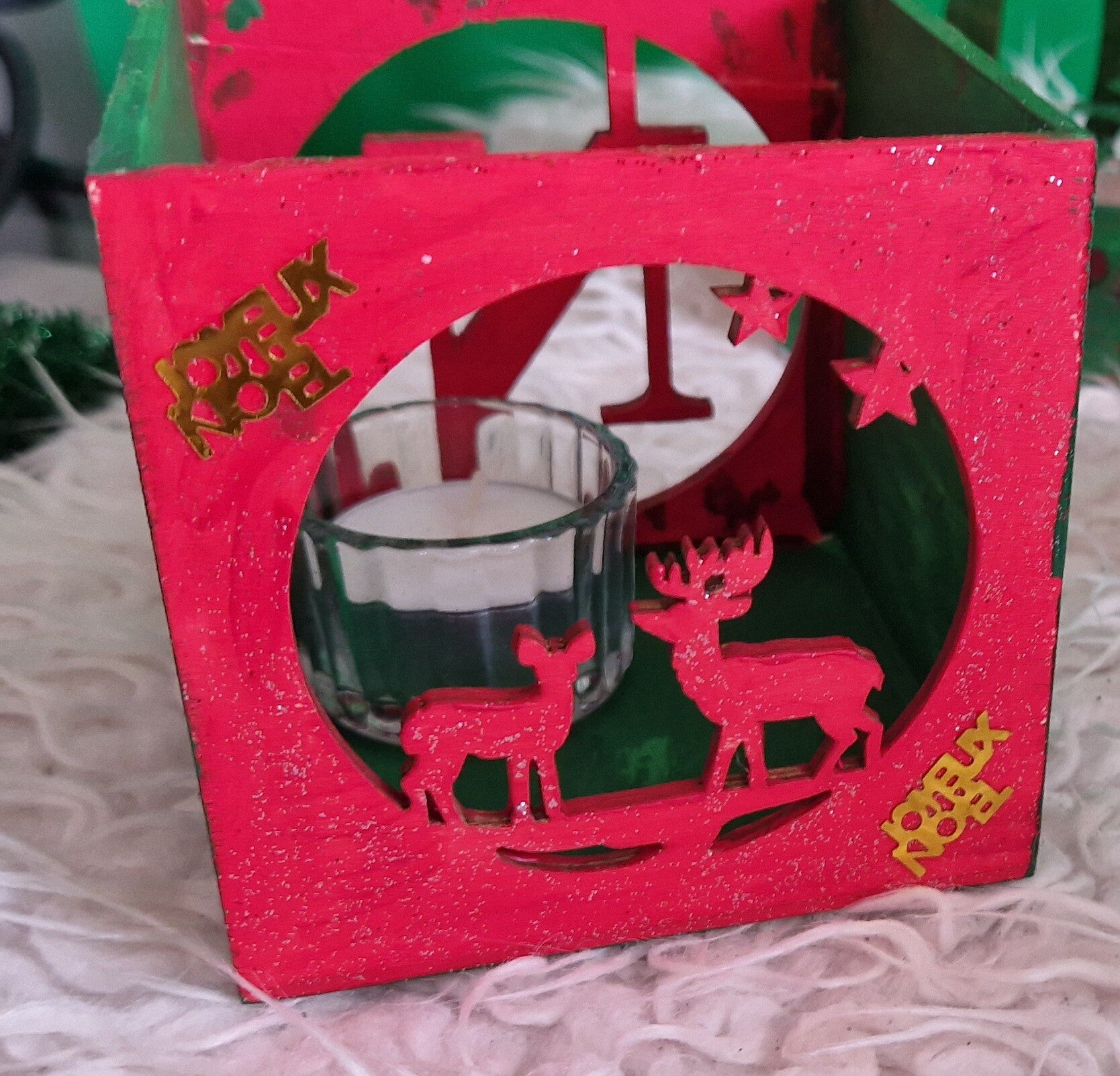 Bougeoir de Noël en bois de pin de couleurs rouge et vert, d'un côté les lettres Noël et de l'autre motif de décoration de Noël