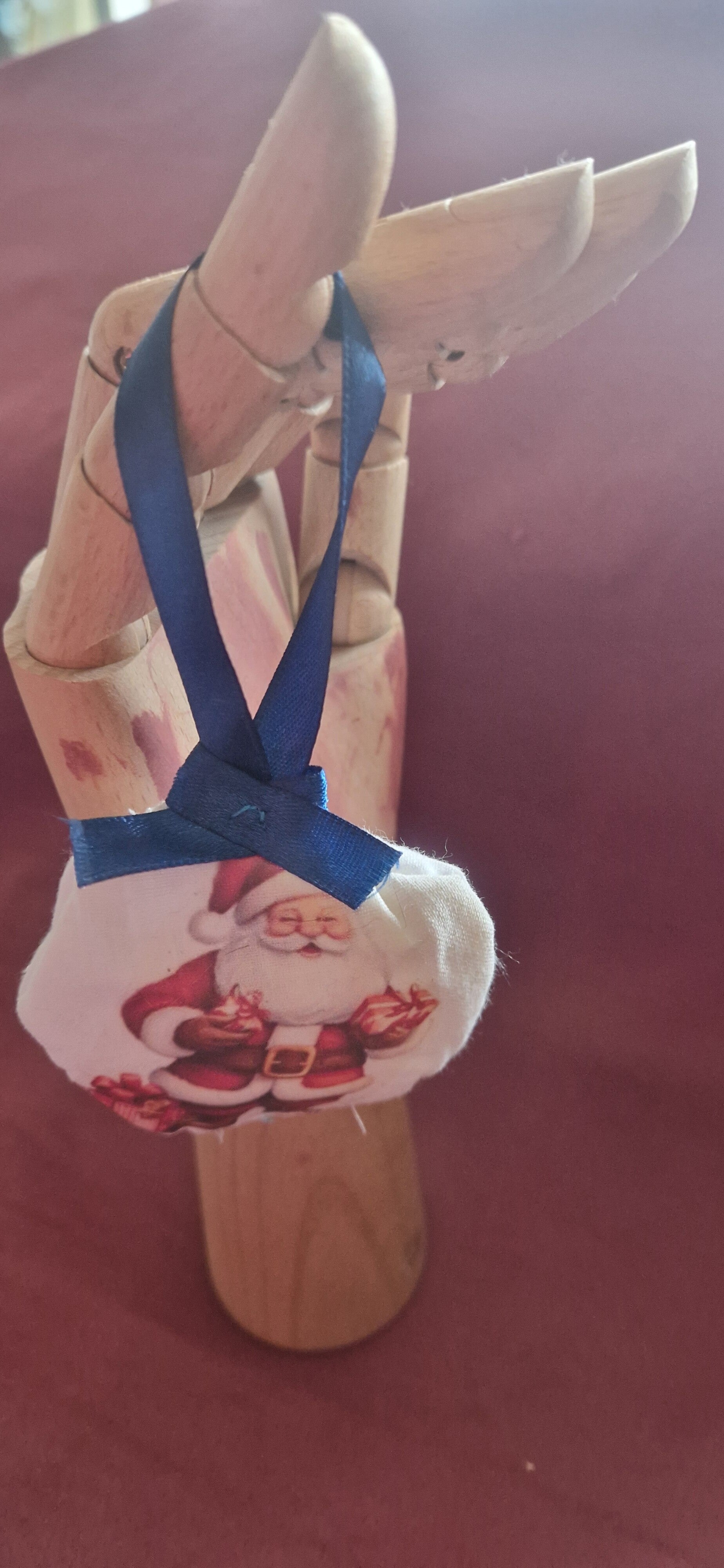 Boule de Noël en tissu et micro billes motif père Noël avec un cadeau ruban au choix rouge, doré, bleu