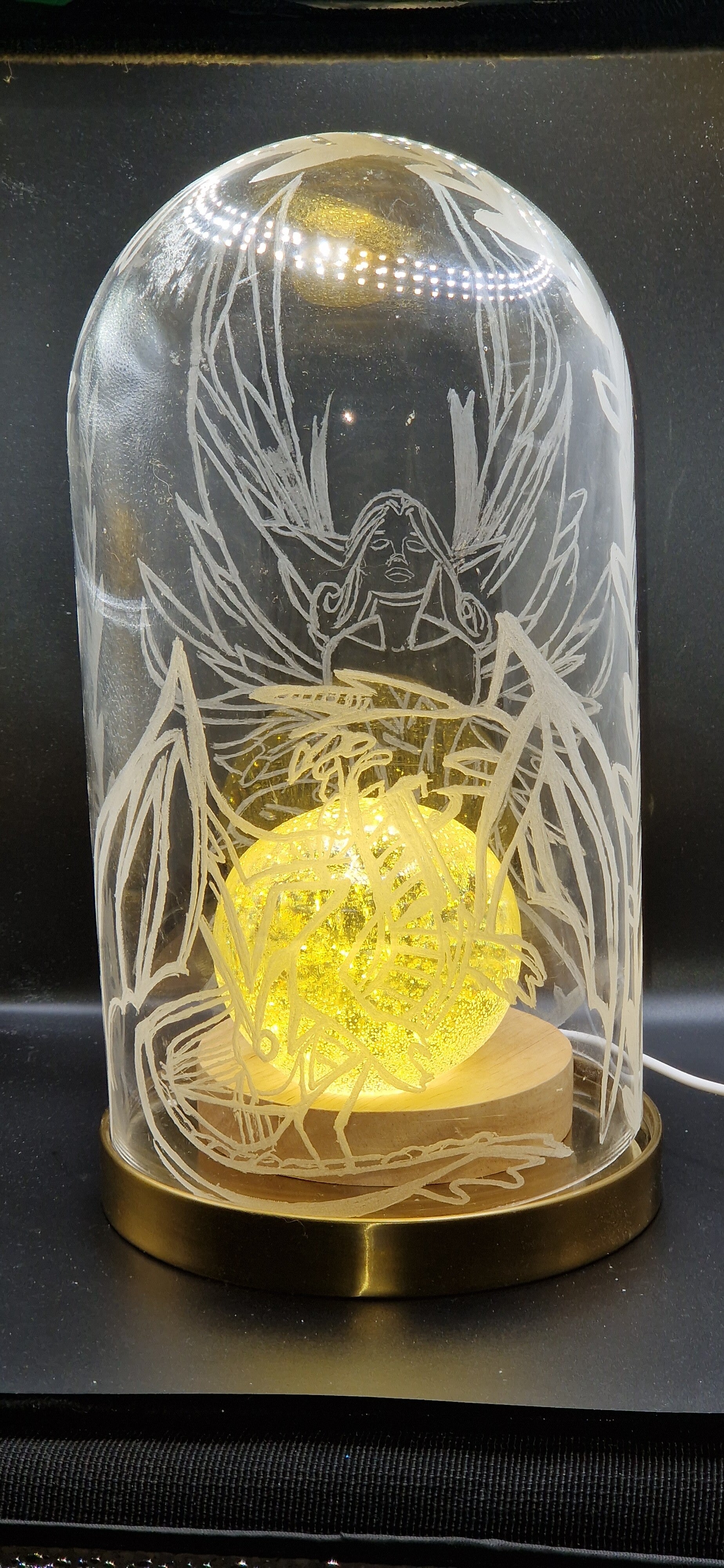 Lampe cloche en verre avec boule résine jaune motif fée
