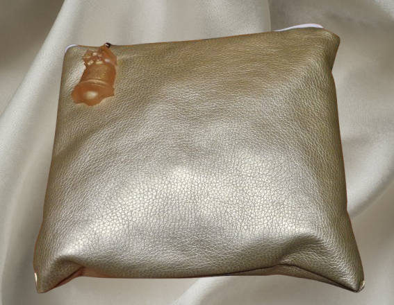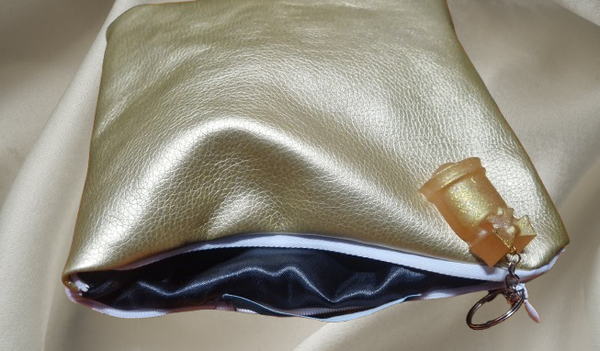 Pochette simili cuir doré foncé intérieur satin noir fermoir blanc dimension 8 cm x 8 cm