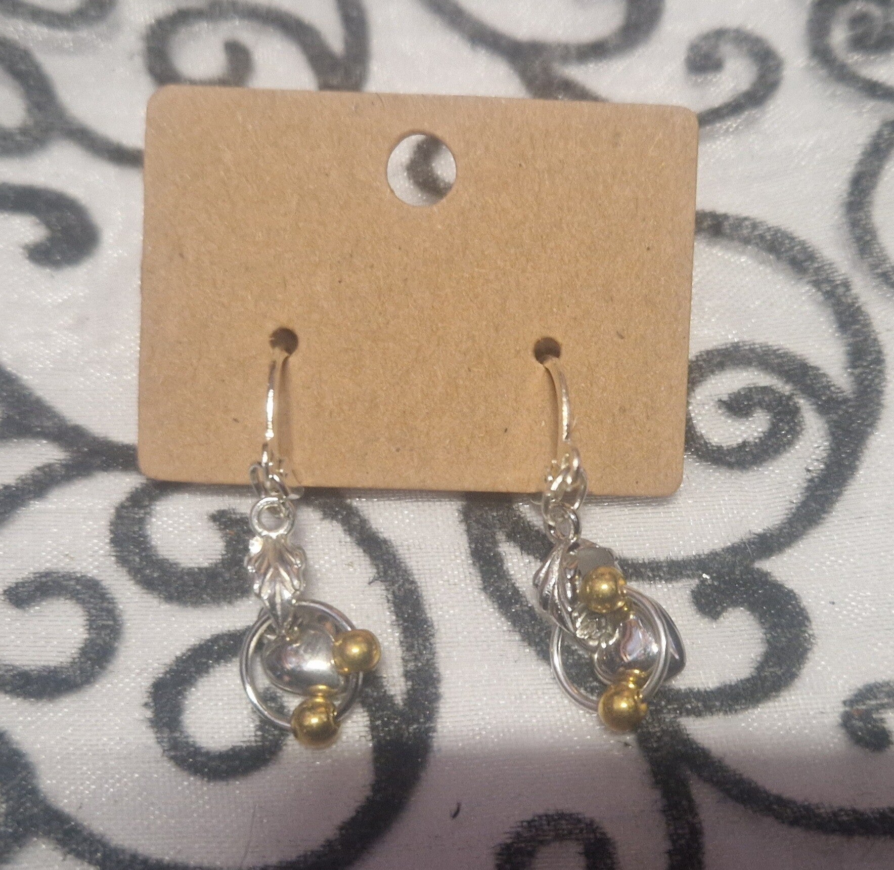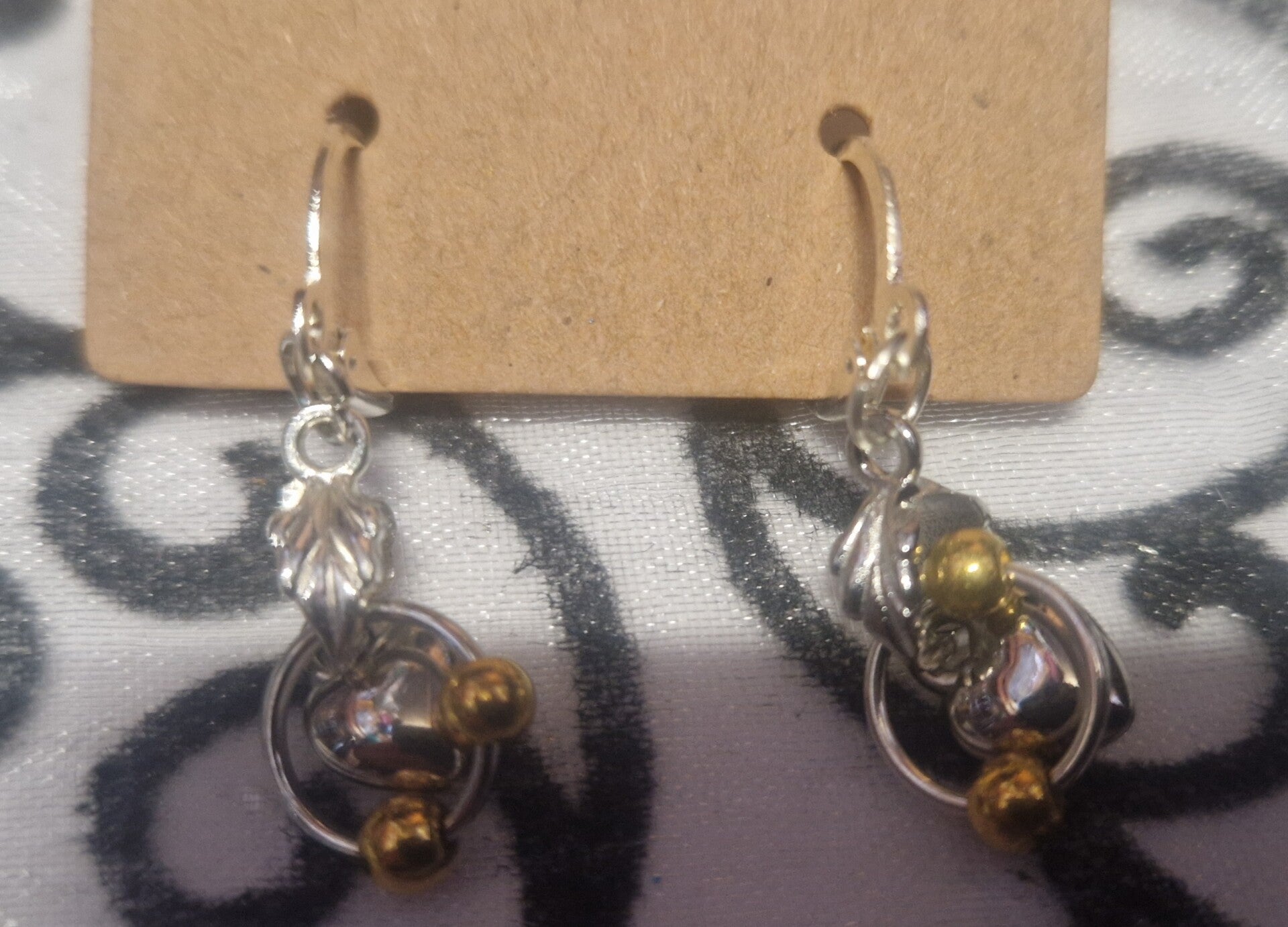Boucle d'oreilles acier, motif feuilles et anneau coeur et perles, couleur argenté et doré, fermoir dormeuse