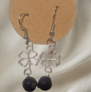 Boucle d'oreilles acier, motif trèfle et perles noires, fermoir hameçon