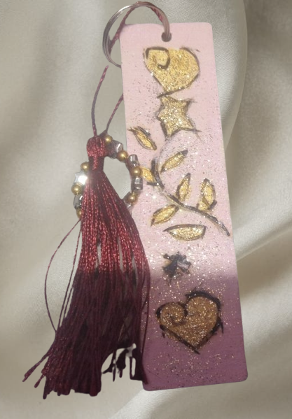 Marque page en bois de pin pyrogravé, motif fleur et cœur doré, fond rose avec paillettes