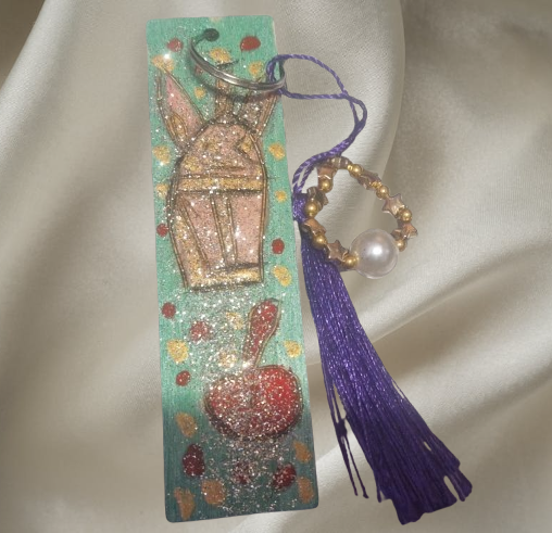 Marque page en bois pyrogravé, motif buble tee lapin rose et dorée, pomme rouge, fond vert avec paillettes