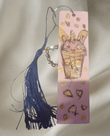 - Marque page en bois pyrogravé,motif buble tee rose et dorée, coeur doré, fond rose avec paillettes, peinture acrylique