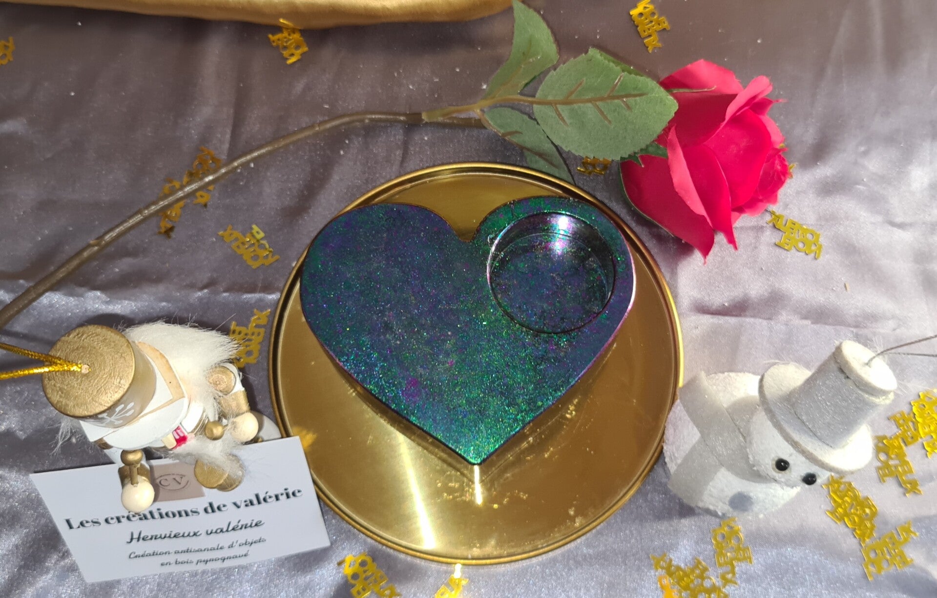 Bougeoir en résine en forme de cœur, couleur bleu vert pailleté (bougie rechauffe plat ) dimension environ 15 cm