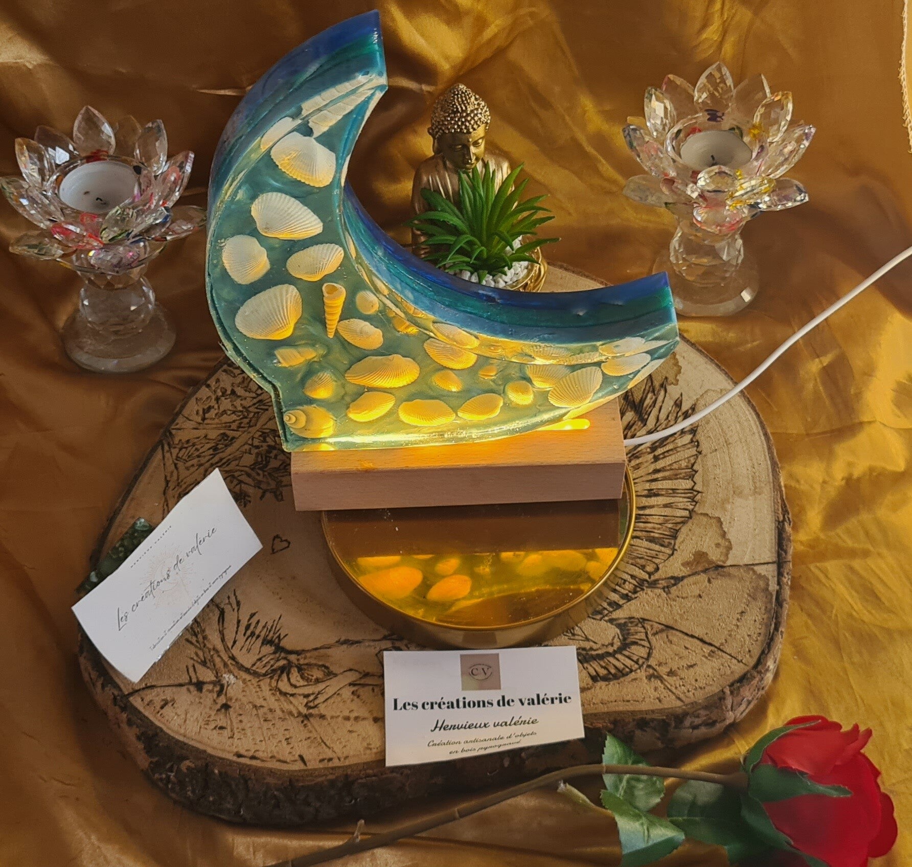 - Lampe en résine et coquillages en forme de lune, couleur bleu vert transparent, support en bois à led avec interrupteur, ( adaptateur non comprit ), dimension 25 cm environ. (Fragile )