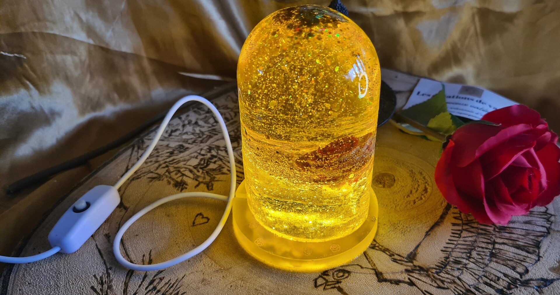 Lampe en résine de forme cylindrée, couleur doré avec paillettes et rose support en bois à led avec interrupteur ( adaptateur non comprit) .