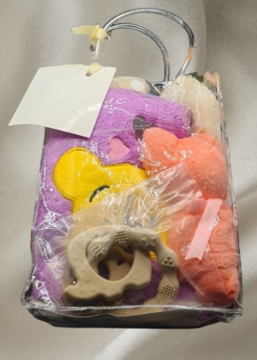 Lot Pochette carré coton éponge, serviette éponge violette avec motif Ourson, anneau dentition, serviette en forme d'ours blanches