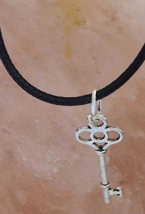 Collier avec pendentif clé argenté modèle 7 cordon ciré cuir noir avec boucles