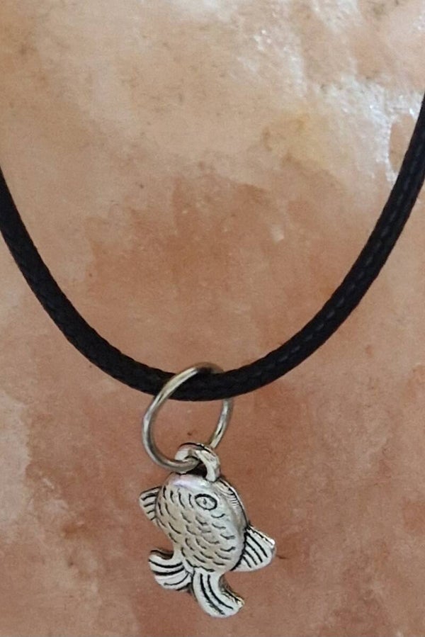 Collier avec pendentif poisson argenté modèle 2 cordon ciré cuir noir avec boucles