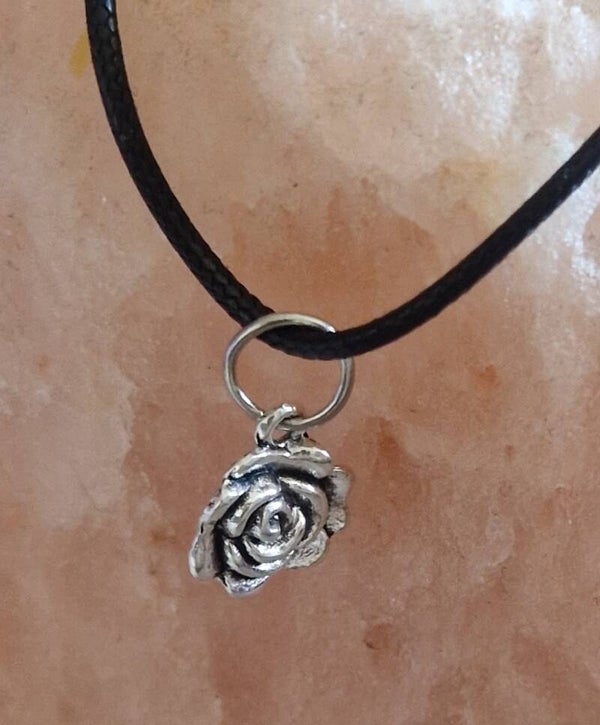 Collier avec pendentif fleur rose argenté modèle 3 cordon ciré cuir noir avec boucles