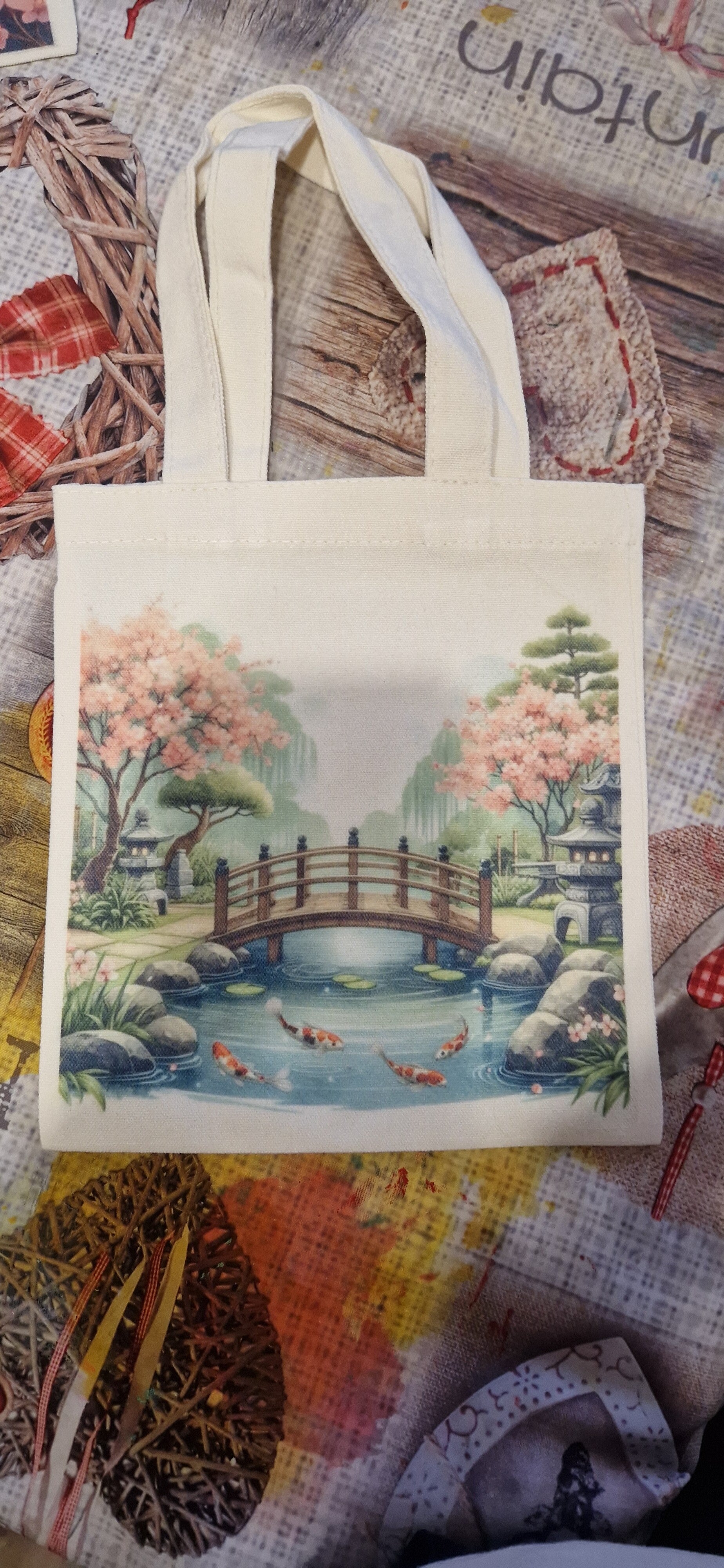 Sac tissu coton crème imprimé motif paysage avec pont