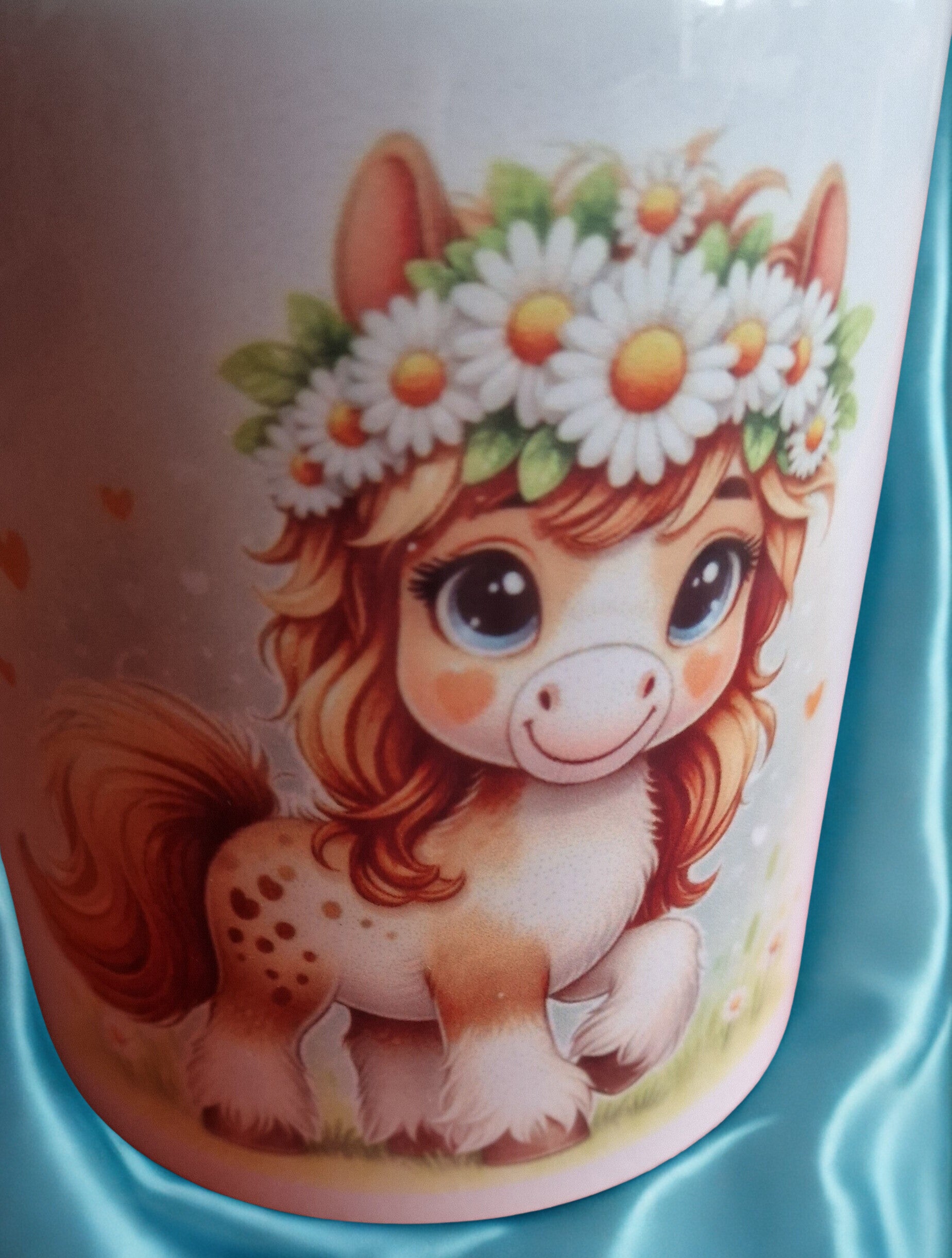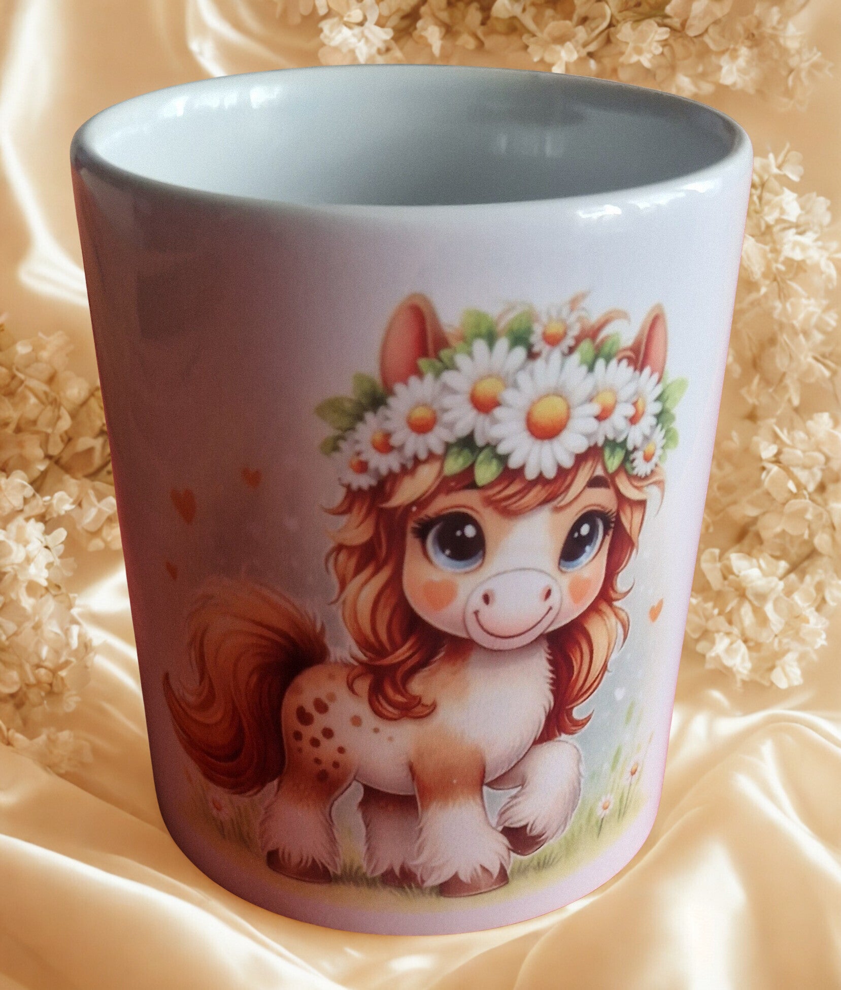 Tasse en céramique blanche motif poney avec couronne florale